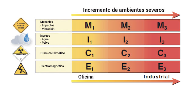 Las clasificaciones ambientales basadas en atributos mecánicos, de ingreso, climáticos/químicos y electromagnéticos (MICE) proporcionan un método para identificar el ambiente requeridas para cada una de las áreas industriales y se clasifican como 1 = Bajo, 2 = Medio y 3 = Alto.